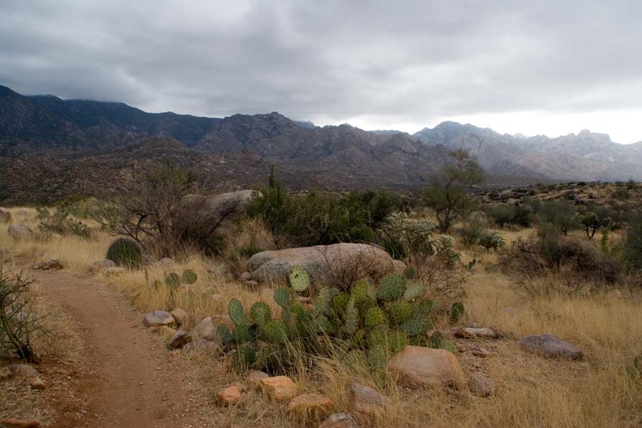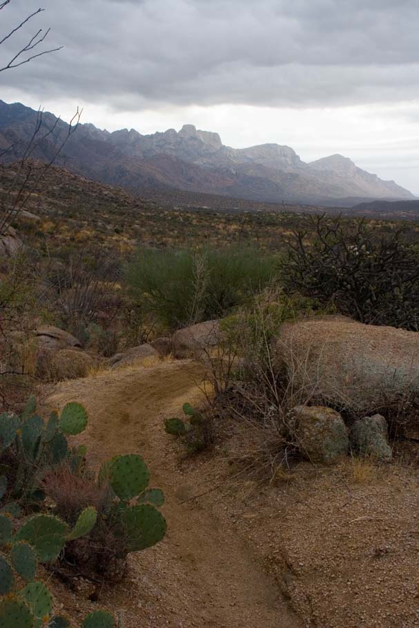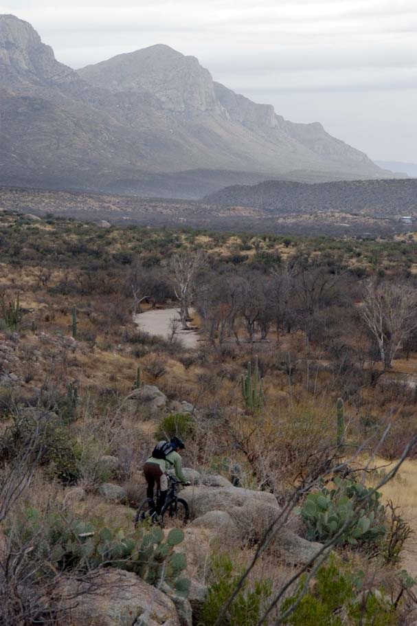 Directions: Located about 20 miles north or downtown Tucson, you will take Oracle Road to East Golder Ranch Road, hang a right and follow the road east 3.7 miles until it turns to dirt. Or just Mapquest It! The trailhead is a dirt lot just short of a cattle guard. Once on your bike, cross the cattle guard and pick up the singletrack of the other side of the road and head north. |