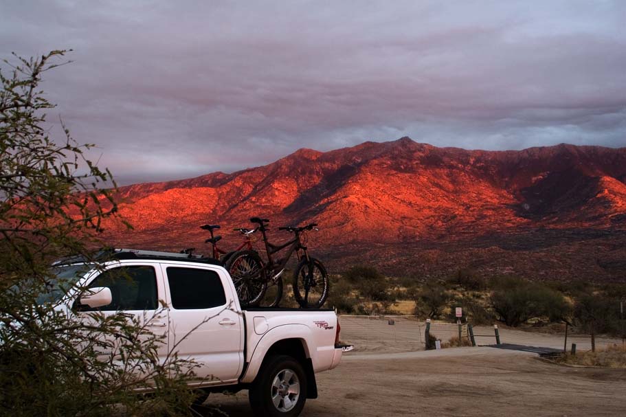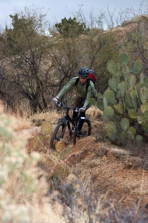 So we all woke up pretty late this morning and realized that we had a few slight flaws in "Plan C" from the day before. We seemed to have forgotten to add "Eat some dinner" to the list and some how managed to sneak "You gotta try this", and "Disturbing Late Night Karaoke in Scottsdale" onto the list. Sometime around 12:30PM we bid Troy a farewell, and started testing the speed rating of my truck tires for most of the way to Tucson. On the drive out we discussed ride options as well as available daylight while flipping through our guide book. We decided on the 50 Year Trail that is just north of Tucson on the western base of the Catalina Mountains.