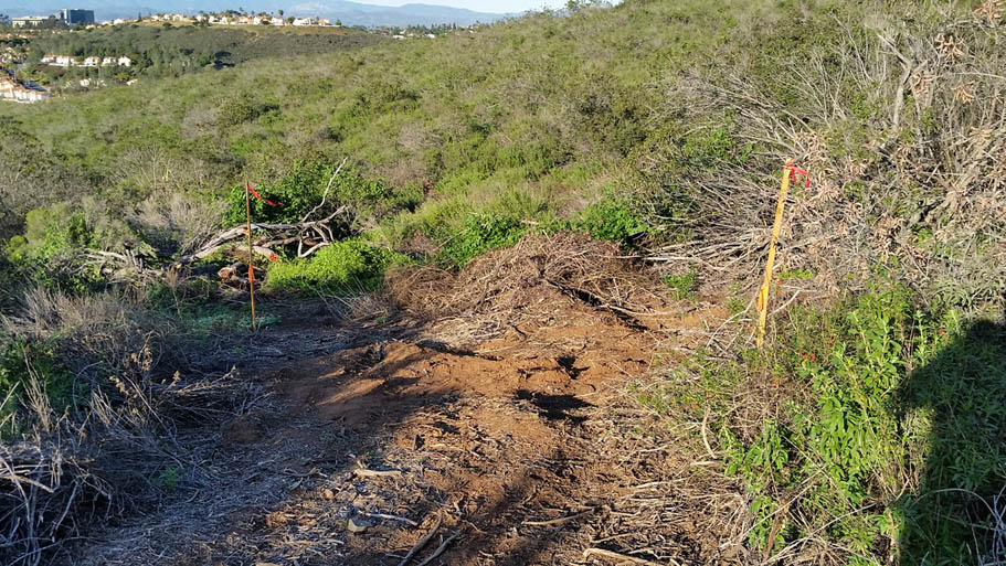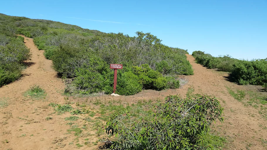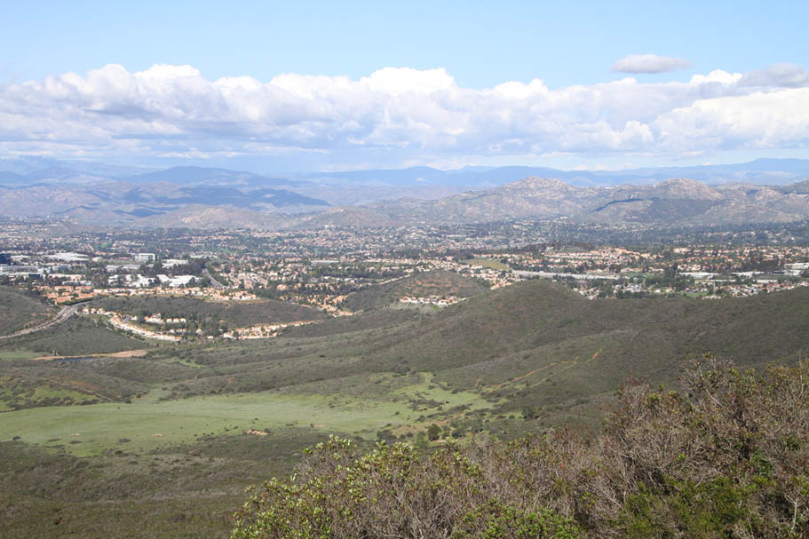 This route is you have more time and would like to hit up the Black Widow trail which an MTB focused downhill/flow trail. From the north end of the parking lot at Black Mountain Ranch Park, pick up the trail that heads to the west just beyond the ball field fences. The trail follows the fence line and turns south to pickup a service road that quickly comes out to Carmel Valley Road. Cross the road (don't be play frogger get on the evening news). And pickup an aqueaduct service road that heads south-southeast directly across the road. The service road will make a small rise then descend quickly and then angle to left and come out on the Maler Road cul-de-sac. You make a left, cross over the street and pickup a single track just to the left of gate across a paved service road. The single track will climb and switch back for a short bit then come out on that paved service road. Turn left and climb up the service road where after 1/10th of a mile you go over a rise where you will coast down to the the junction of the Black Mountain Summit fireroad 1.3 miles. Settle in for a bit of fire road climbing. It is steady but not a bruiser. At 2.6 miles you will pass the Night Hawk connector trail on your right, take note of it but keep on climbing. At 2.9 miles you will pass by the top of the Black Widow trail on your left. Don't even think about dropping in now, you need to get that summit checked off, keep on climbing. At 3.3 miles you reach the summit. Take in some views, call your Mom (tell her I said Hiiiiiiii!) and maybe have a snack.