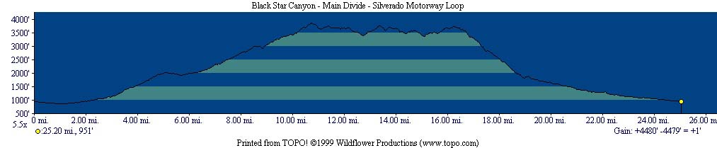 When you download GPS data to the TOPO! software or if you freehand draw a route onto the map the mileage reflected by the software does no account for the distance you travel up and down. It computes and reads the elevation changes, but it does not account for it in the mileage. That is why your bike computer will always indicate more mileage than you GPS or the TOPO software. On a fairly flat or a short ride this difference is negligible. However, as distance and elevation change of a ride increases this difference can become quite large. To get a more accurate measurement of the mileage shown on the map you have to do a little math. To the left is the elevation profile for the Black Star Canyon, Main Divide, Silverado Loop ride that has both a lot distance and elevation changes. In the lower left hand corner is the mileage readout from mile 0 to the mark were the yellow dot is located. (The yellow dot is all the way to the right at the end of this route). On the bottom right hand corner is the readout of the + and - elevation changes. Since this is a loop ride the + and - should be the same and they are real close.