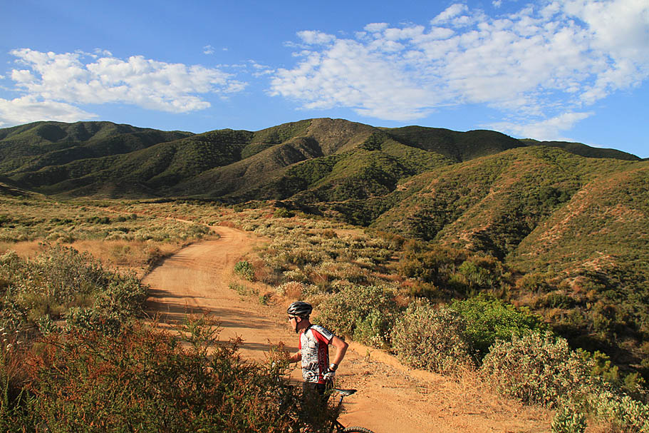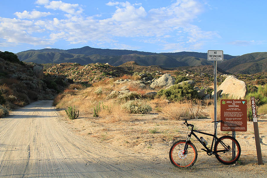 This was a July ride, so we made arrangements for an early start. We were rolling on the dirt at 7AM. San Diego still had the "June Gloom" thing going but it was sunny with some patches of clouds here and there. After the first 1/10th of a mile the truck trail (labeled 8S05) crosses over a large sandy wash. You will see tracks going up and down the wash as well as a noticeable doubletrack alongside the was wash to your left. Ignore those as you want to go up. That is really all you need to know to navigate this route. When in doubt, go up on the most "main" looking route. When you run out of up, you should be a High Point. Overall the grade of this climb is not bad, some of the steepest bits are in the beginning just after the wash and as you near junction of the Palomar Divide Truck Trail up top. Unlike Nate Harrision on the south side of the mountain which is "on grade" the entire route, the High Point truck trail often nearly flattens our and sometime reverses for short bits as it craves it way up the mountain. While this route is no piece of cake, it is a little easier that Nate Harrison.