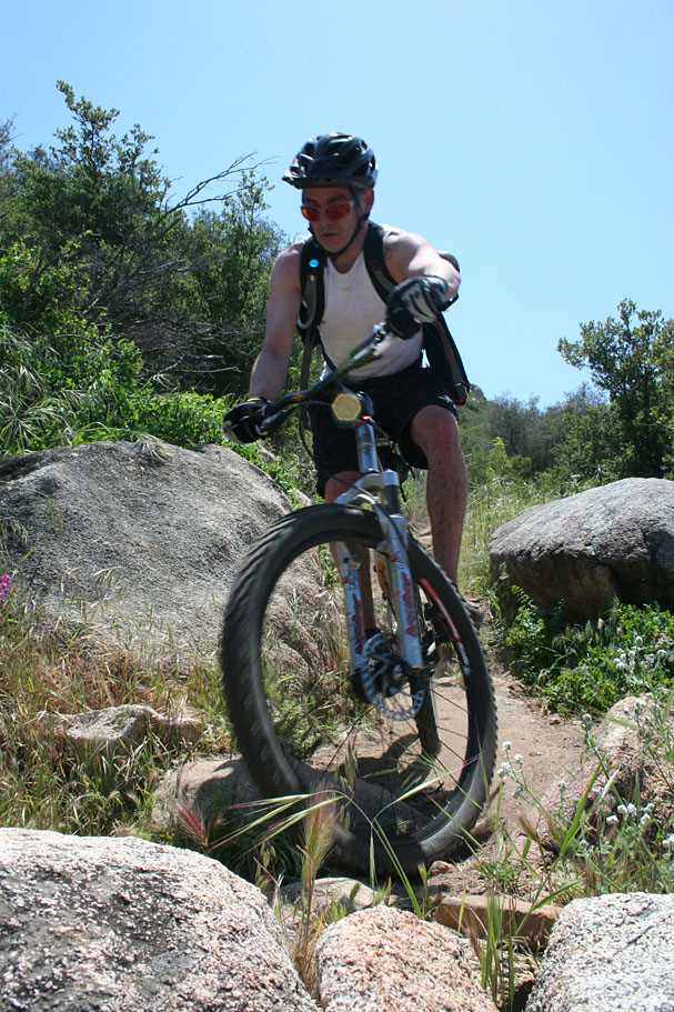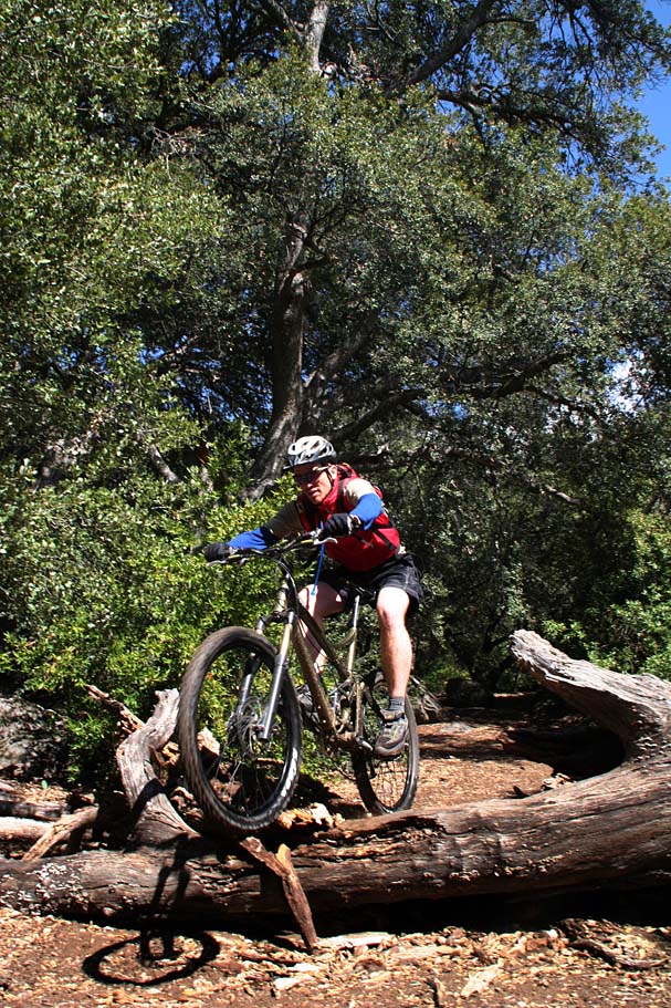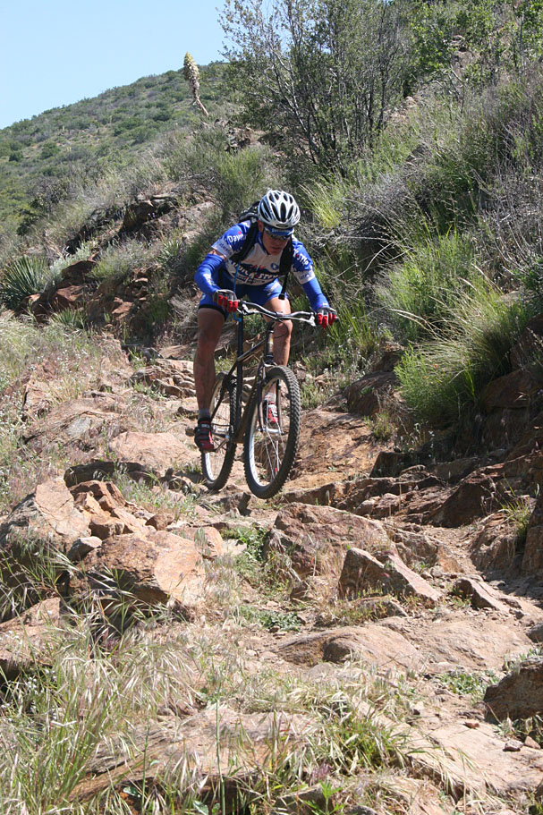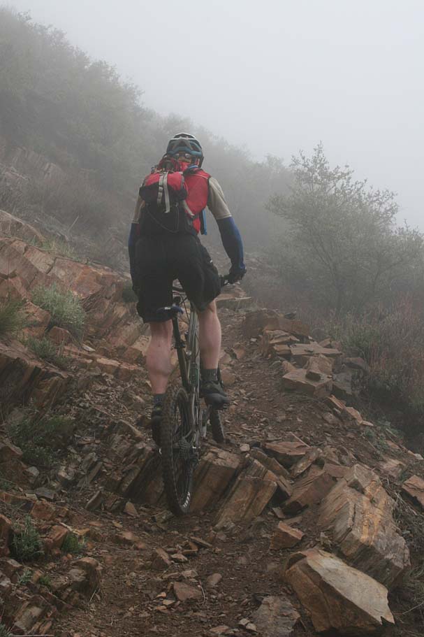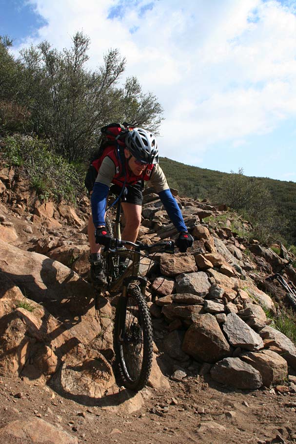 You will come to a couple of switchbacks where the trail changes dramatically from forest to chaparral.  Also the trail starts to get rockier and more technical.   At the first creek crossing you will encounter the first really technical rocky outcropping.  After this section you have a long descent that is packed with drops and rocks that requires good bike handling skills.  Speed can be your friend here.