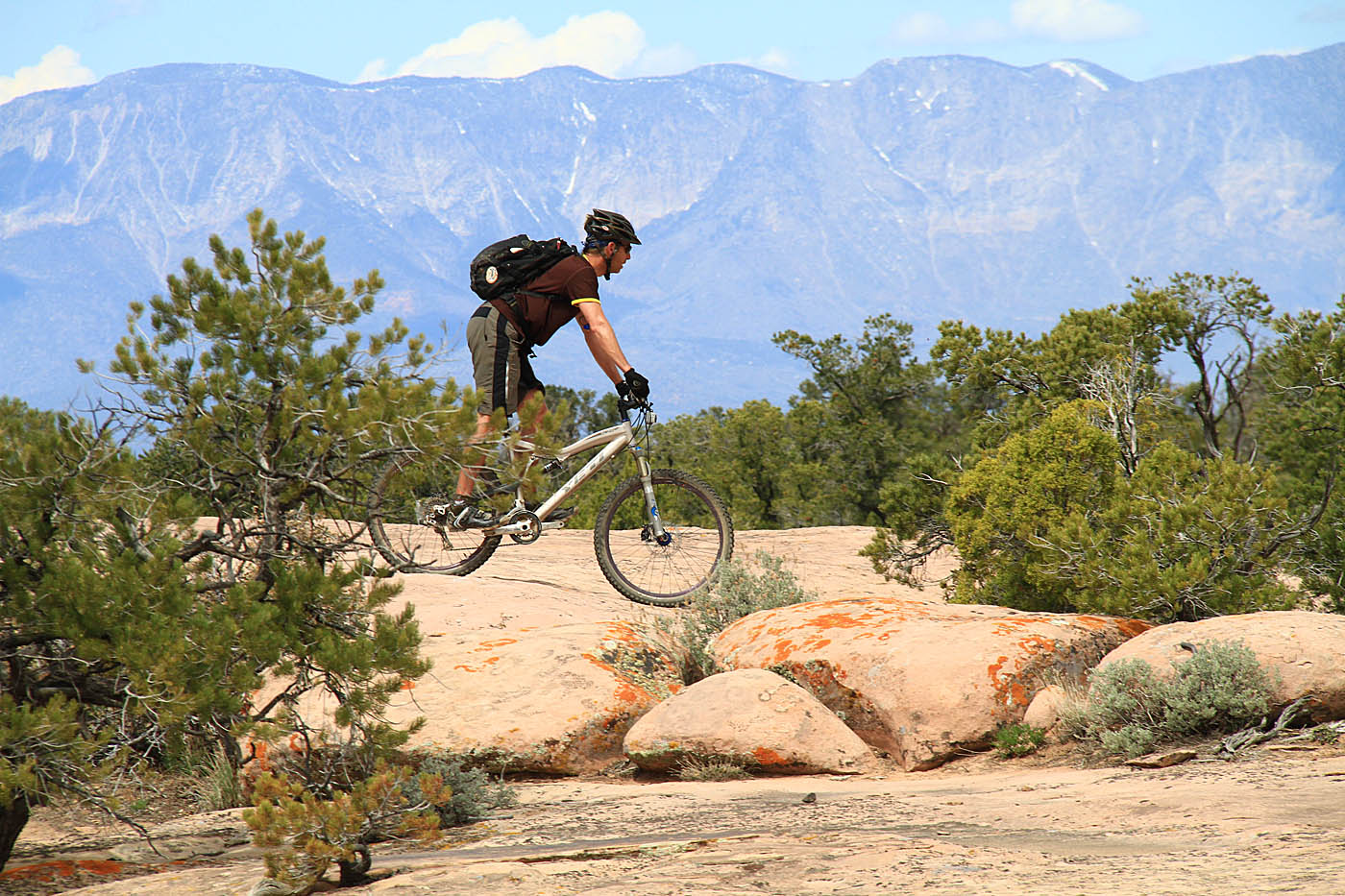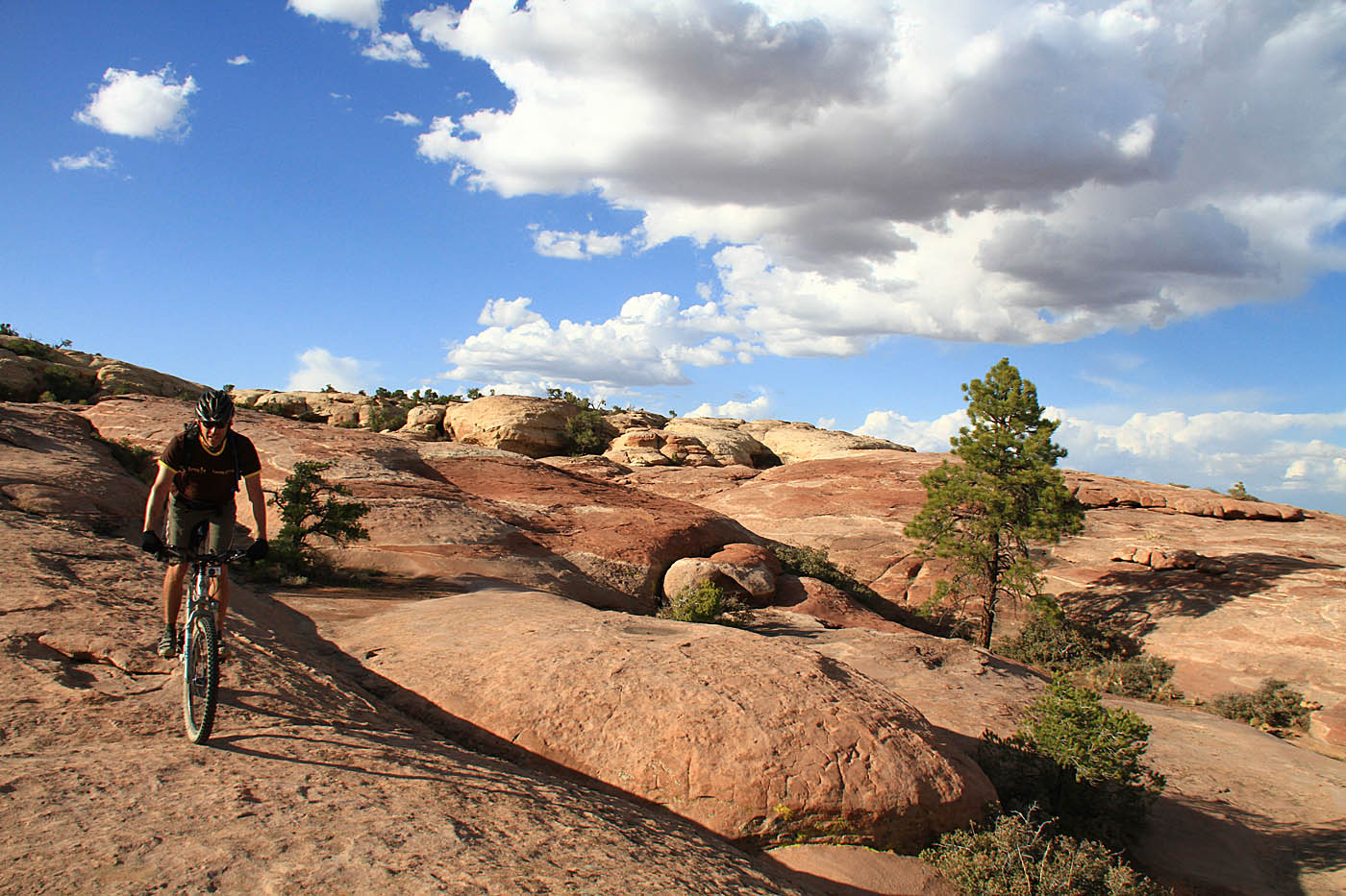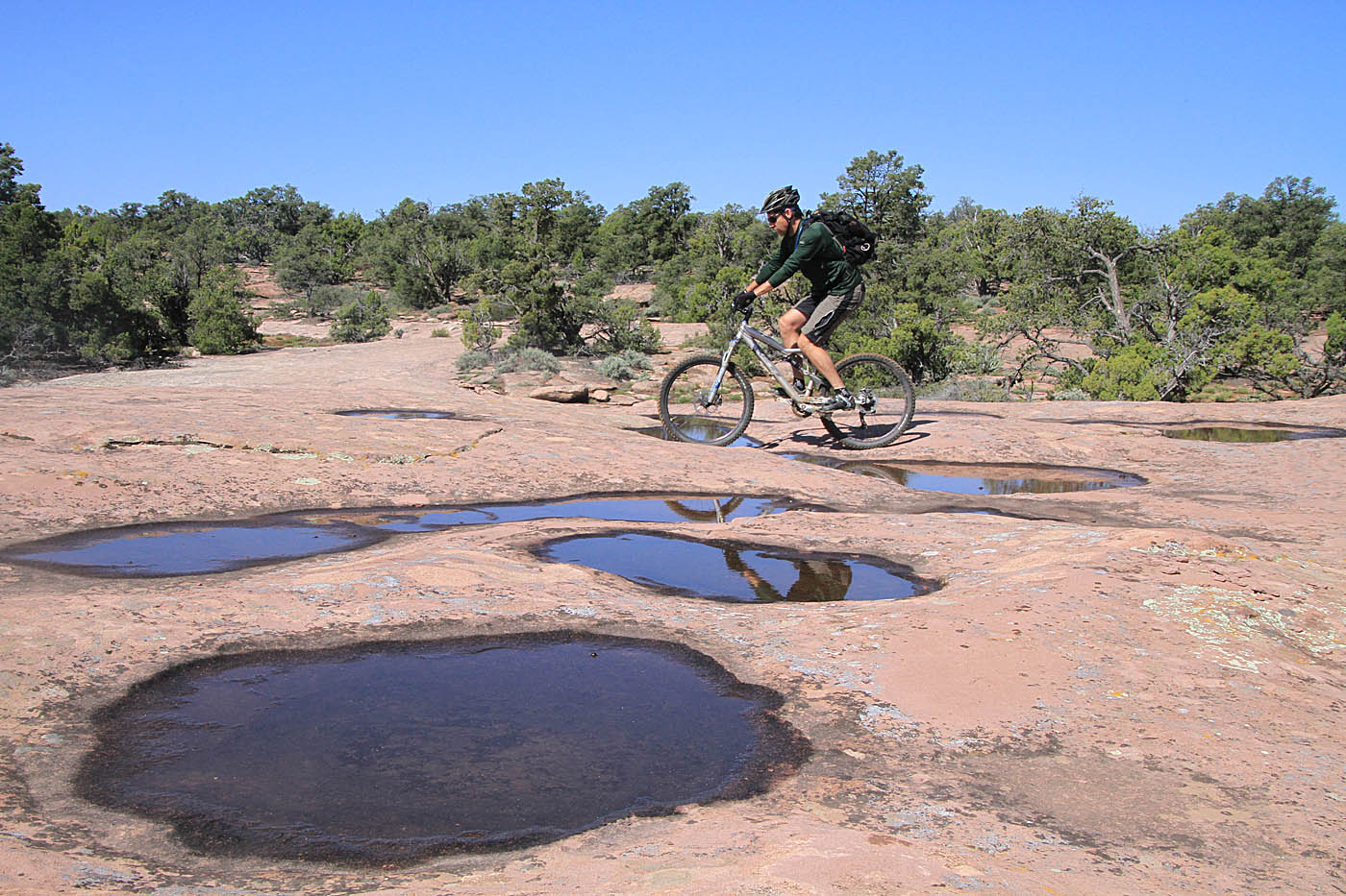 Besides the great views and tight singletracks, I really enjoyed the investigating mindset you have to stay in while out on the slickrock. The route finding here varies from interesting to downright difficult. There are plenty of options for free-forming lines on the rock. Before you do that, take a look around and make sure you stay off the untrammeled cryptobiotic soils. The are a vital part of the ecosystem here and one bike track or footprint on this stuff can take a hundred years or more to recover. There are only about a million awesome lines out here to chose from that will not mess with the fragile soils here, so please pick one of them.