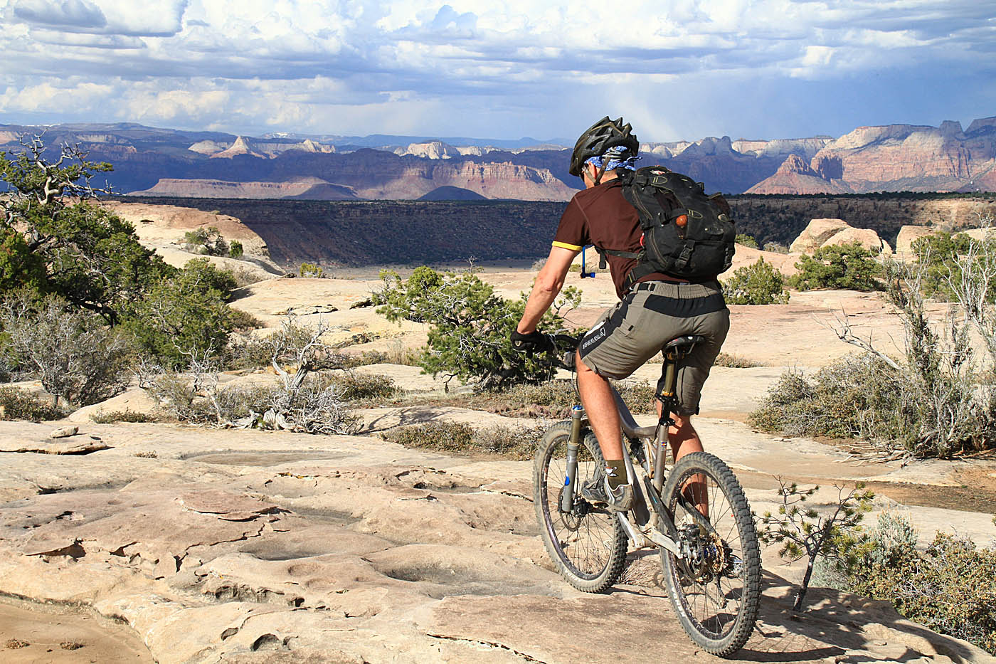 Little Creek Mesa is a real hoot for those who love great techish singletrack, playing on slick rock, incredible views and have a since of adventure. While located only about 15 miles outside of Hurricane Utah (as a crow flys), it will take you about an hour to get there from town. The slickrock with drops, ledges and rollers coupled with twisty forested singletracks that often run along the rim of the mesa are a real treat. You will need to have good navigational skills as the trail are marked only with rock cairns that are not always easily spotted. Danger awaits the overzealous who freeform on the rocks without snooping around first. There is little in the way of serious elevation change here, but there are lots of short and strenuous sections. If you have not done Gooseberry Mesa before, I recommended you you get in a ride there first. Gooseberry is pretty well marked and it will help develop your navigational senses on this type of terrain that will make your experience at Little Creek Mesa much more enjoyable.