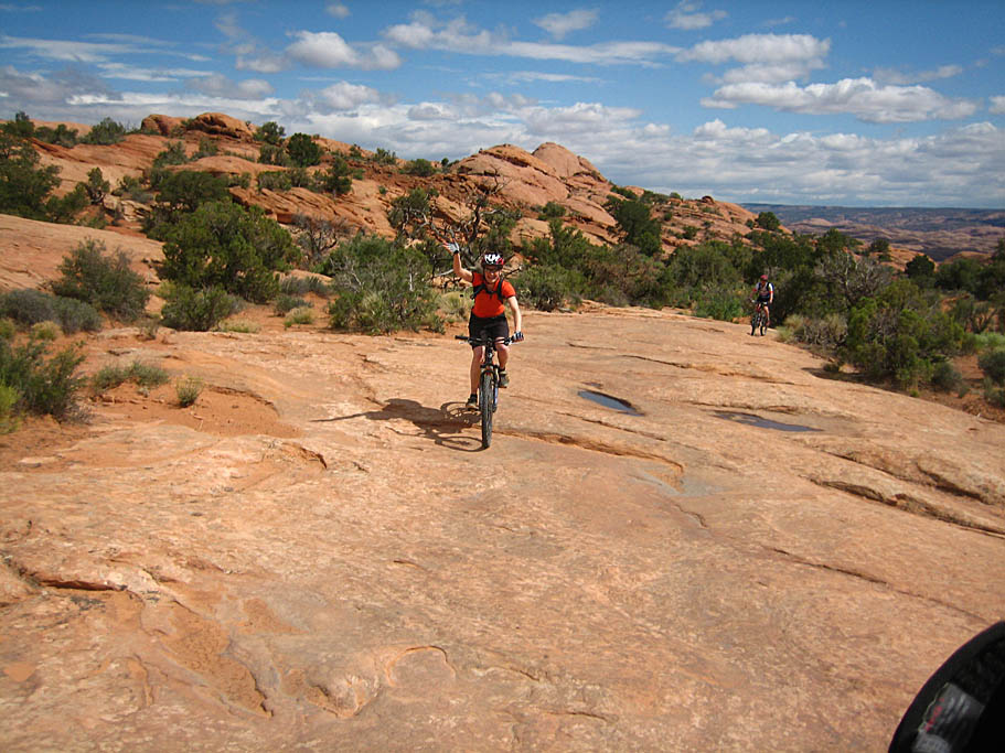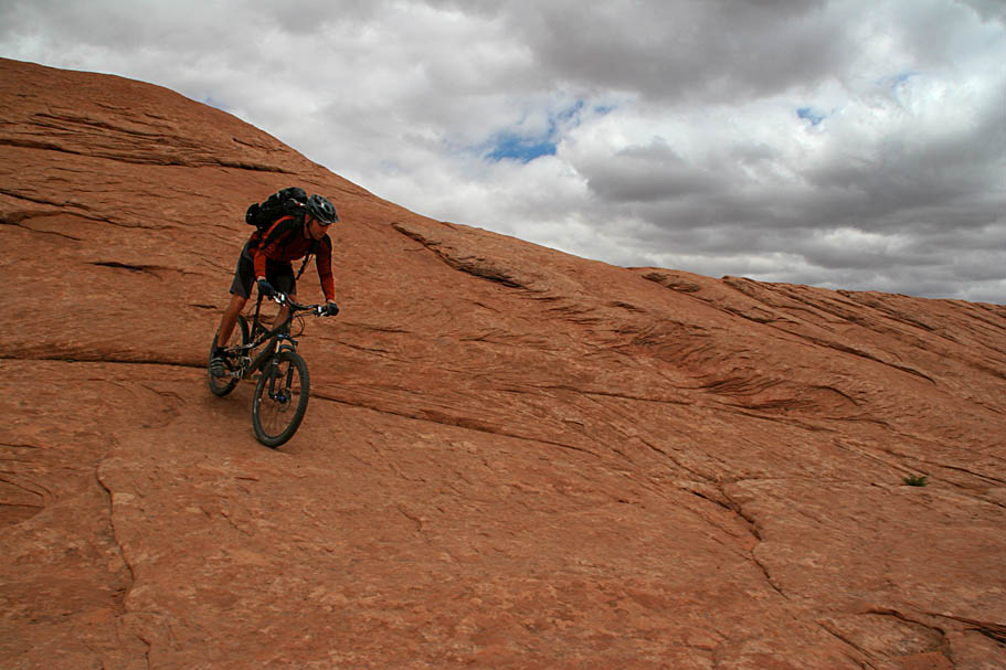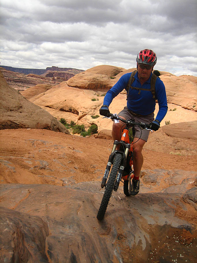 After playing on this area of the slickrock we rejoined that main trail where it goes just to the left of the right-hand dome I was talking about earlier. There are a couple of hella-steep slickrock sections that you can grunt up or if you have some good route finding skills you can freeform a more contouring or switchbacking route up to the top of these. You will notice on quite a few pictures on this page, we are looking off to our left our right while riding on the rock. I really dig being in the "ferret out a line" mode while on the rocks.
