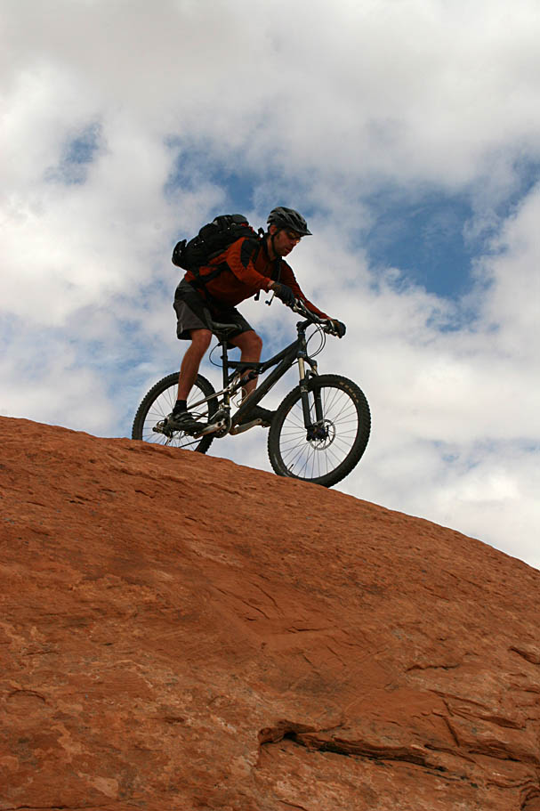 It was pretty cool out near the edge of the mesa. We could look down and see our campsite as well a good chunk of the Amasa Back Mesa that we rode our first day here. There was also a grand view of the Moab Rim trail. There was a large group of Four-Wheelers on the the Moab Rim trail that day and they looked like tiny little specks from our vantage point. If you look close in the picture on the left you can see the jeeps. You obviously do not want to get too close to the edge here. Most of the time the "edge" is a rounded slope where you would most likely slide off the mesa before the actual fall started. That is why it is vitally important that you scope out your route before committing to a line.
