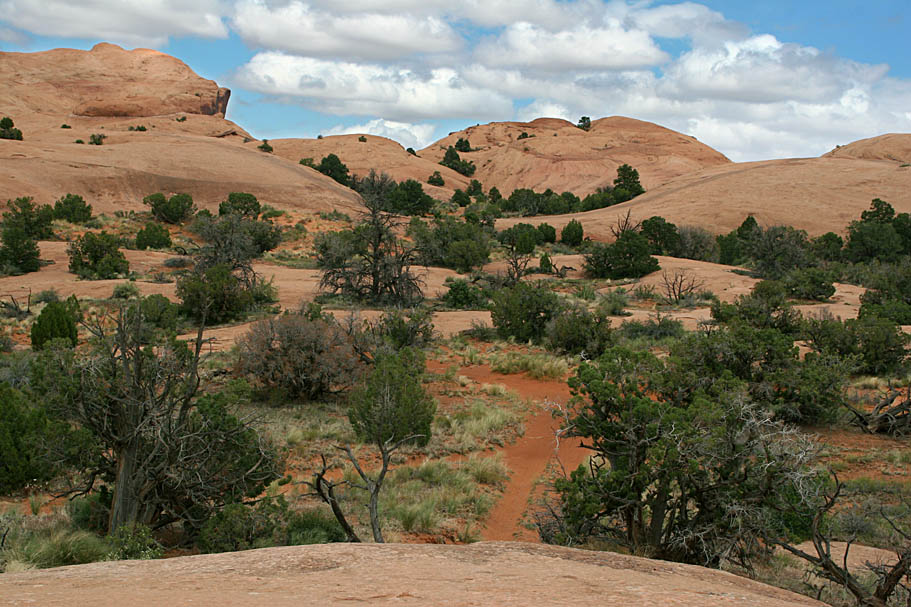 Somewhere around the five mile mark you come out into a significant field of slickrock where you will see four domes a head of you. The trail will go between the far right dome and the one just to the left of it. Between here and there are lots of opportunities to freeform on the slickrock and even work your way out to the edge of the mesa. Free forming on the slickrock out to the edge is exactly what we did.