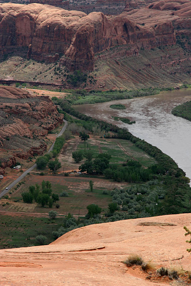 The views of the Moab Valley below were simply impressive. Highways 128, 191, Potash Road and Kane Creek Roads were all just thin little lines from this vantage point. You could also see were the seepage from the tailings pile from the old Atlas Uranium Mine is killing the trees between the pile and the Colorado River.