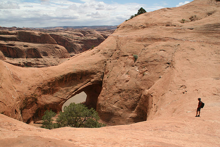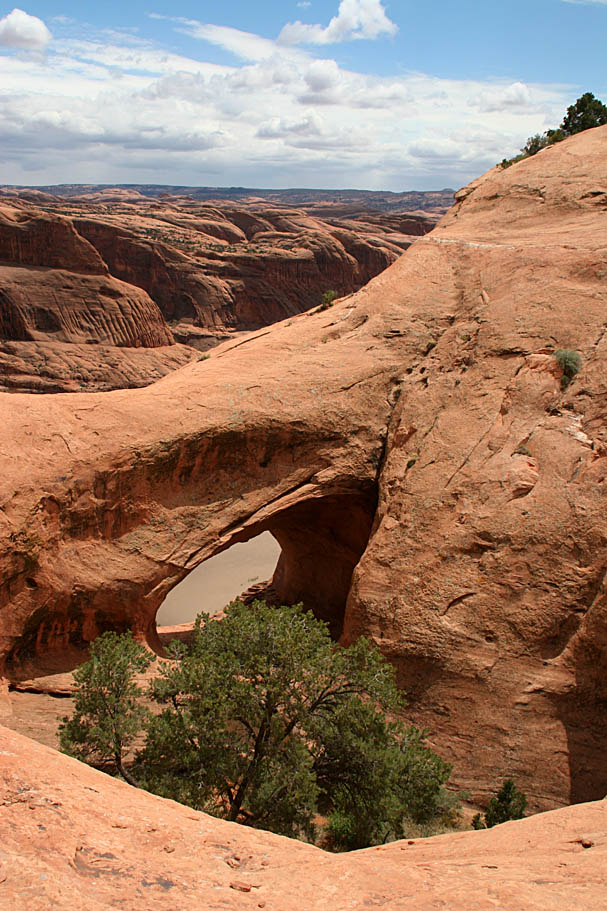 Before long we came to a spur out to the picturesque Little Arch. A few folks have ridden across the arch. If it was on flat ground you could do all day long but when a fall of hundreds of feet and death awaits, I think I'll pass. If you get at the right angle you can look through the arch and see the trailhead for the Moab Rim trail. It was really cool the following day to look up from that trailhead and see that arch. I was also amazed at the trees growing in the pockets in the sandstone. It makes you really appreaciate why you should be careful to stay off the cryptbiotic soils as they take hundreds of years make these otherwise desolated spot, suitable for plants to survive in.