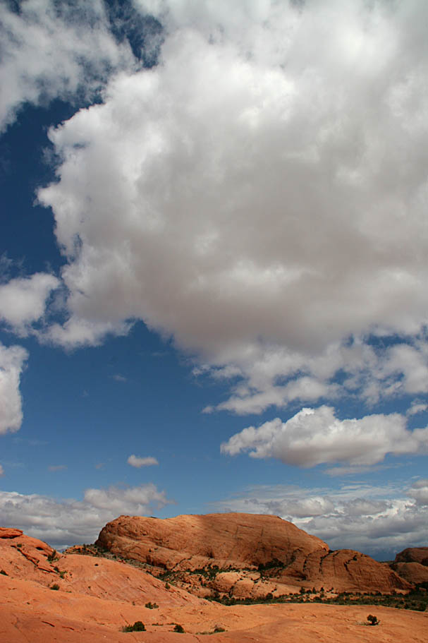 Somewhere around the 8 mile mark you come to a T-intersection with the domes behind your right shoulder around the 4 or 5 o'clock position. We ran into a couple of Canadian gals who followed the loop in the clockwise direction and from their description it sounded like the counter-clockwise direction is certainly the way to go. We hung a right here and did a rocky climb for about half mile up to the rim where we were treated to some great views of the Moab Valley.
