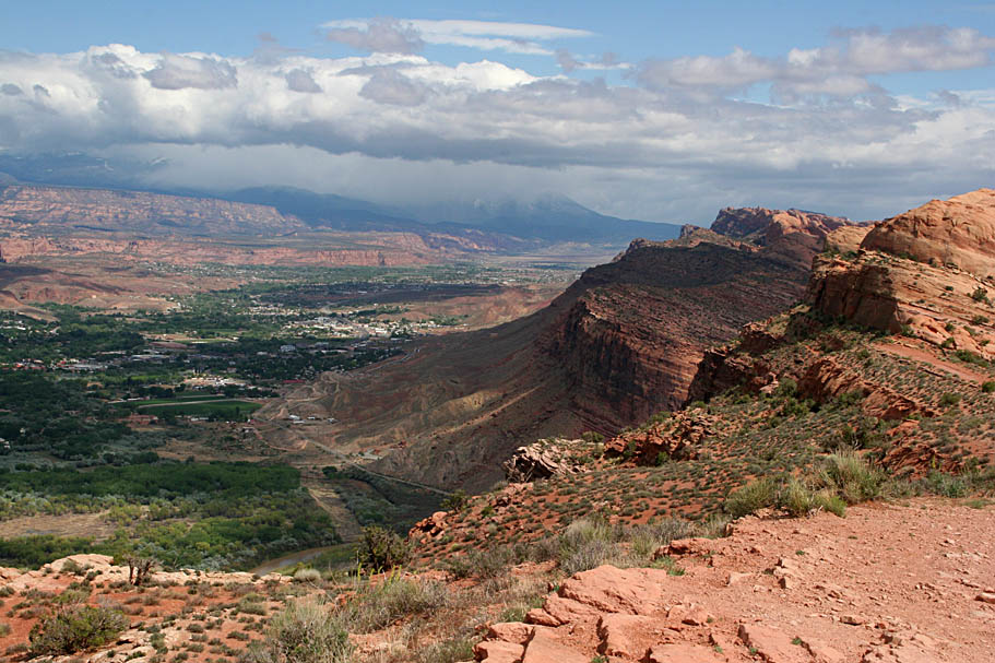 After gawking at the writing we went past the trailhead and continued on out Potash road to take in some views of Long Canyon and lookup into Dead Horse Point State Park. It was also pretty impressive to see just how large Amasa Back Mesa is as we drove around its entire finger. While on the sightseeing diversion the clouds would occasionally break so we were excited about the idea of not getting rained on during the ride.
