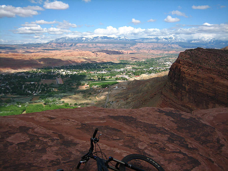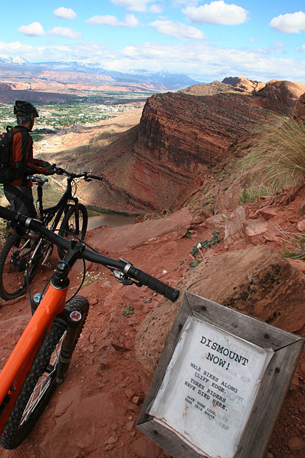 I’m going to pause from the story of the day to warn you about the Portal trail. It will reset your scales for exposure on a trail. It is off the charts extreme. Nobody falls off the Portal trail and lives to talk about it. The exposed sections have majestically beautiful views to a certain and quick death. Lee Bridgers in his Mountain Biking Moab book dedicates a couple of pages to bringing home life and the Portal trail. This is just a tiny excerpt of a larger fascinating story on how he relates the life of one of his friends to the Portal trail.