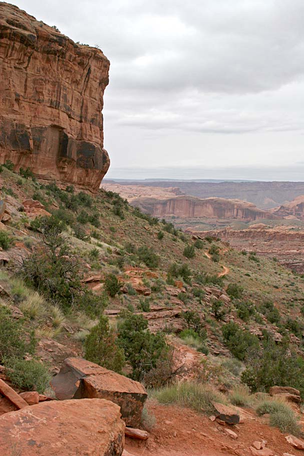 The doubletrack ends at the border of the Negro Bill Canyon Wilderness Study Area near the upper end of Jackass Canyon . The singletrack from here is really killer as it works its way along a shelf above Jackass Canyon . The views are pretty cool above this box canyon, especially as you near the end of the canyon where it joins with the Colorado Riverway. There are some exposed sections where you can look down at the river and highway 128. These exposed sections are combined with some technical features that will have prudent people putting a foot down. The penalty for failure in these couple of spots can be extreme to lethal.