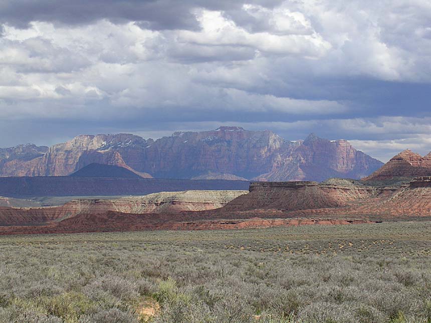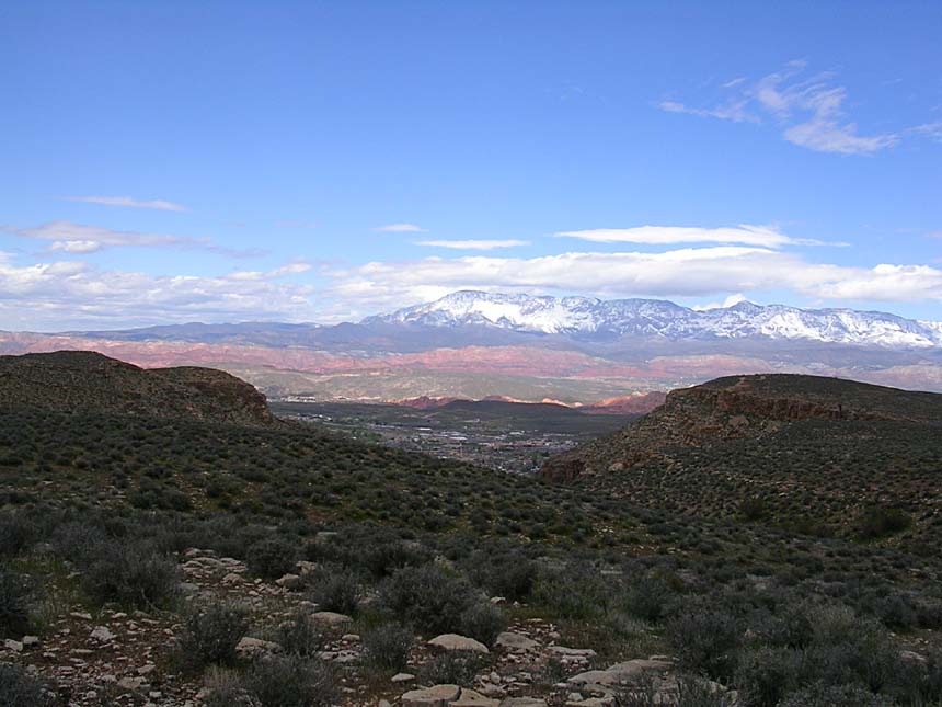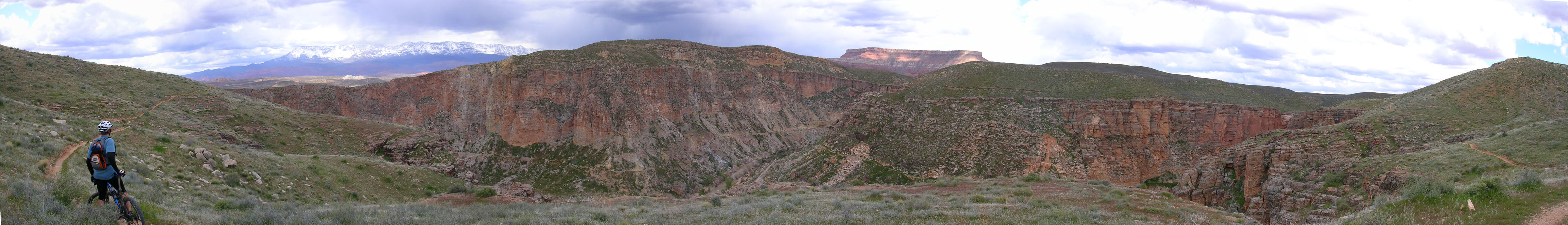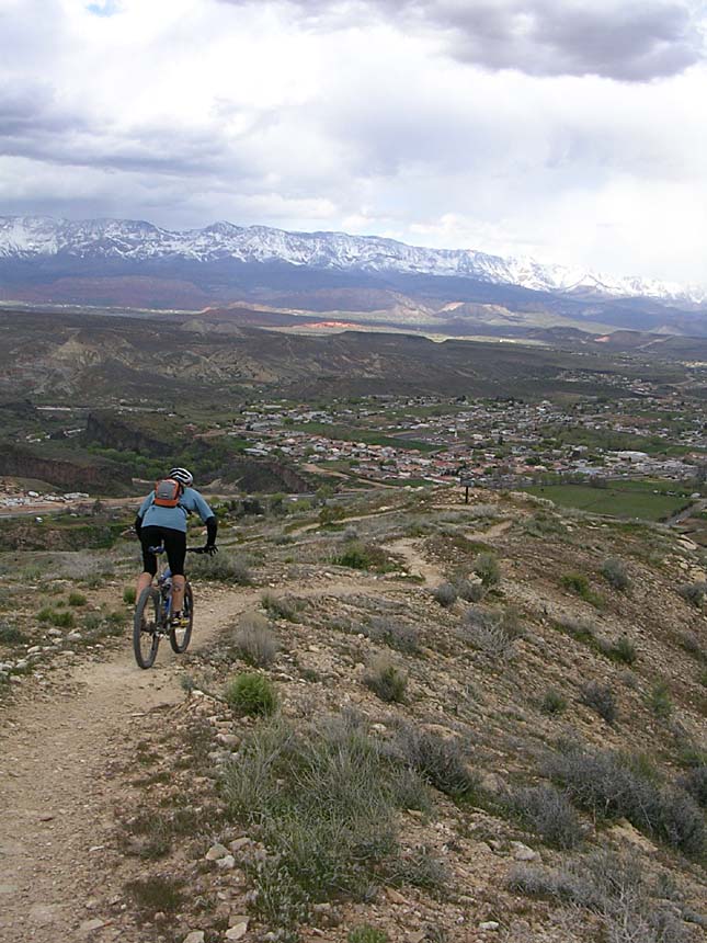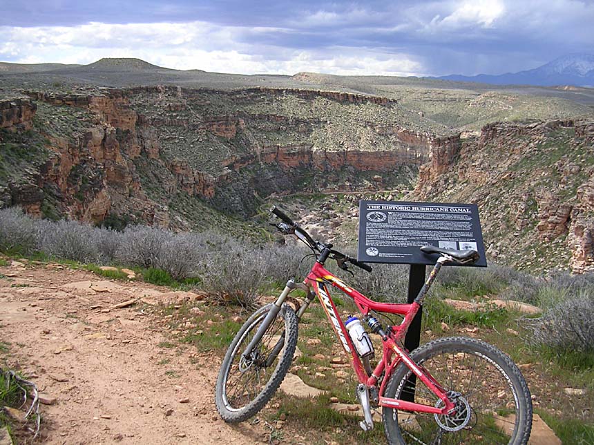 The Hurricane Cliffs trail system, consists mainly of the Goulds Rim trail, the Goulds trail, the JEM Trail, and the Hurricane Rim Trail. These trails form a 21.5 mile loop of which about 19 miles of so of it is mighty fine singletrack. We did this loop counter clockwise starting from the Hurricane Hill trailhead. The ride started out with a 2 mile or so fire road climb up to the Goulds Rim trail. Goulds Rim is mostly a gradual climb, but with the scenery you will barely notice you are climbing. There are even some short descents here and there to spice things up. From the Gould Rim trail we took the Goulds trail we was very twisty and interesting with lots of whoop-de-doos. There was more substantial climbing here but they were all short spurts type of climbing where you only notice the overhaul gain when you look behind you. Goulds brought us out on highway 59 and the junction with the JEM trailhead. The JEM trail is all about catering to your inner speed demon. Near the beginning of the trail are some technical switchbacks but those soon give way to blazing downhill singletrack that works its way across open grazing land. We screamed along the JEM for what seemed like forever but in reality was close to 15 minutes. Somewhere along this singletrack my bike computer registered the max speed of the day at 29.5 mph. We were actually a little speed limited as Billy's trail bike did not have a big ring and he could only spin so fast. We nearly blew by the junction with the Hurricane Rim trail as the JEM trail continues on downhill towards the town of Virgin. Once on the Hurricane Rim trail we were treated to the most scenic views of the entire ride. Often times you are peering down at the Virgin River far below in a very rugged canyon. We spent most of our time climbing on this superb singletrack back to the truck. Next time I'm going to do this loop in other directions as it will be great either way.